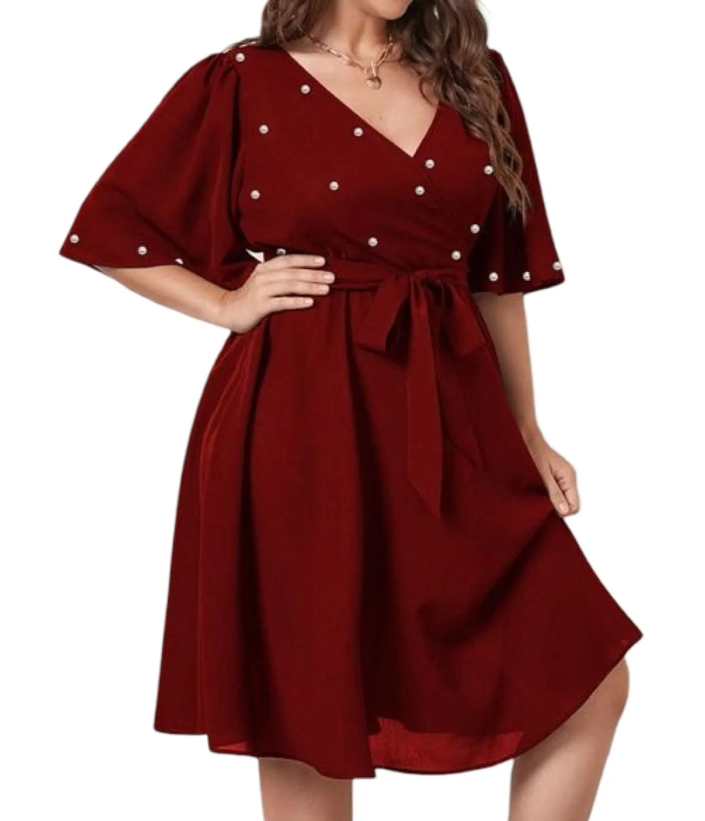 Condition: Brand new with tags and ready to wear. Details: Burgundy faux wrap midi dress with pearl accents on the bodice and sleeves. Features a V neckline, short bell sleeves, and an elastic waist with a matching self tie belt for a flattering fit. A beautiful option for holiday events, festive gatherings, or chic everyday styling. Ships within 2 business days. All sales final. Measurements: Bust: 22.5 in pit to pit / 45 in full bust. Length: 45 in. All measurements are approximate and shown in photos. Keywords: christmas, festive, holiday, plussize, elegant, chic, party, winter, burgundy, feminine
