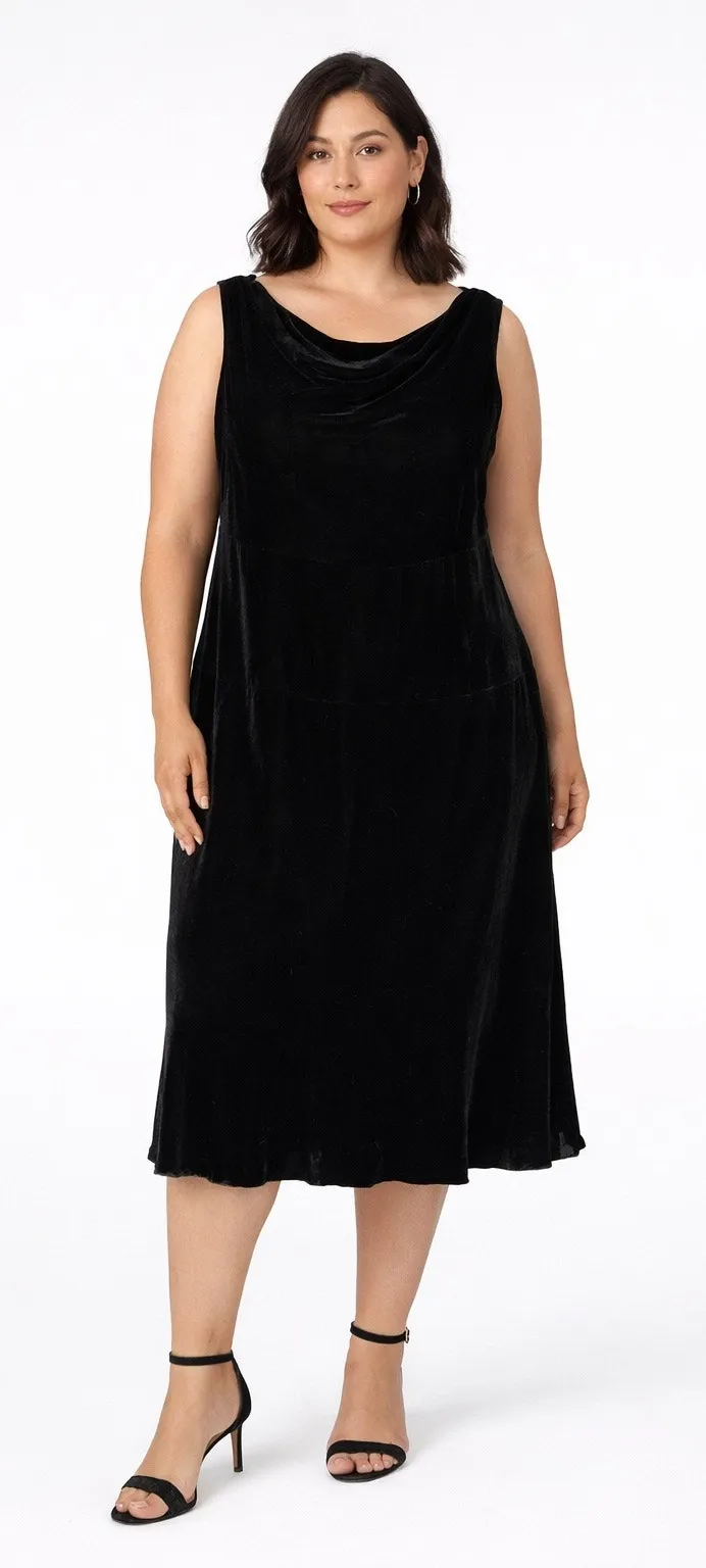 Elegant black velvet dress with a soft draped cowl neckline and fluid slip-style silhouette. Luxe ra... Show more
