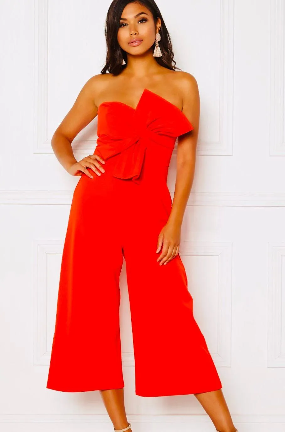 Rare! Absolutely beautiful and extravagant statement piece! Has a retro-chic vibe with a modern twist. One of those hot timeless fashion pieces that are easy to throw on and look smashing. Comes in vibrant Melrose Red. Desinged with a sexy strapless neckline, hidden side zip closure, cut-out on the back, flowy wide leg, and elegant, dramatic knotted bow in the front. Rubber lined for support Zipper and clasp functional Made from hi-quality material Was purchased in Bloomingdale's ***** out of STOCK******* No stains Small tiny snag … cant see it when its on Brand name renvy perfect for december / Christmas/ wedding guest