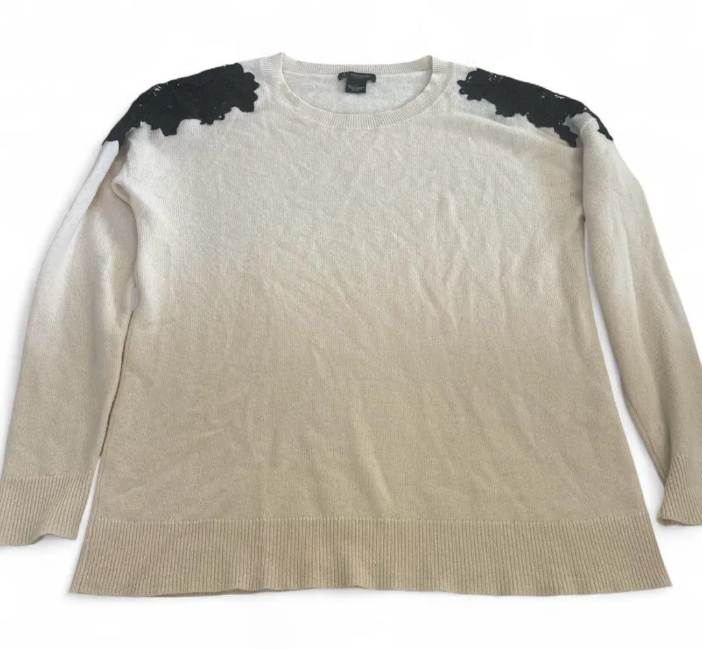 Elegant cream cashmere sweater. Soft and luxurious feel. This is a Bloomingdale's women's snow detailed 2-ply 100% cashmere sweater with black crocheted lace detail on the shoulder No holes or stains Lightweight sweater This sweater runs a little bit big see pictures for measurements for a better fit.