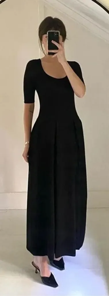 Blossom black, solid, short sleeve, scoop neck midi dress. Midweight rayon linen blend knit fabric construction with contrasting semi-sheer fine knit bodice. Pleat detailing at waist. Fitted capped short sleeves & low scoop neckline. Side seam pockets. Drop waist silhouette with structured hip, straight cut, midaxi length skirt. Pullover styling. Excellent condition. Shell: 62% rayon, 28% polyester, 10% linen Bust: 27.5” Waist: 27” Length: 50” --- E5256