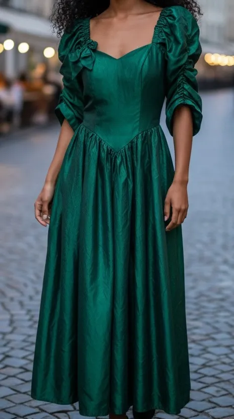 Blossoms vintage 80’s dress Size 10, measures small Dark green color Drop v waist Back zip closure Sweetheart neckline 3/4 length sleeves Maxi length Excellent condition, no stains or flaws Puffed and ruched sleeves Chest 16” across Waist 13” across Length from shoulder to hem 55”
