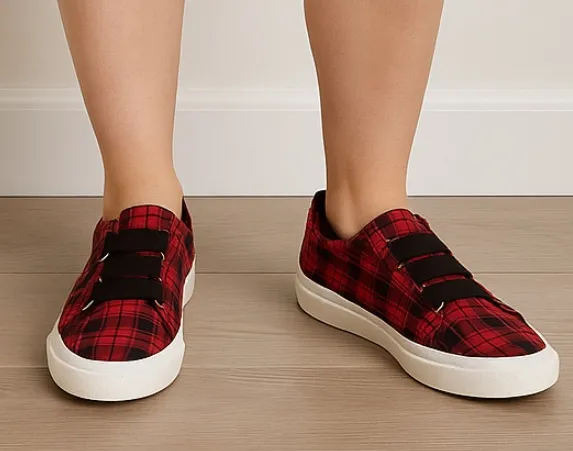 Casual women Blowfish Malibu slip-on sneakers with a trendy red & black plaid upper, black elastic s... Show more