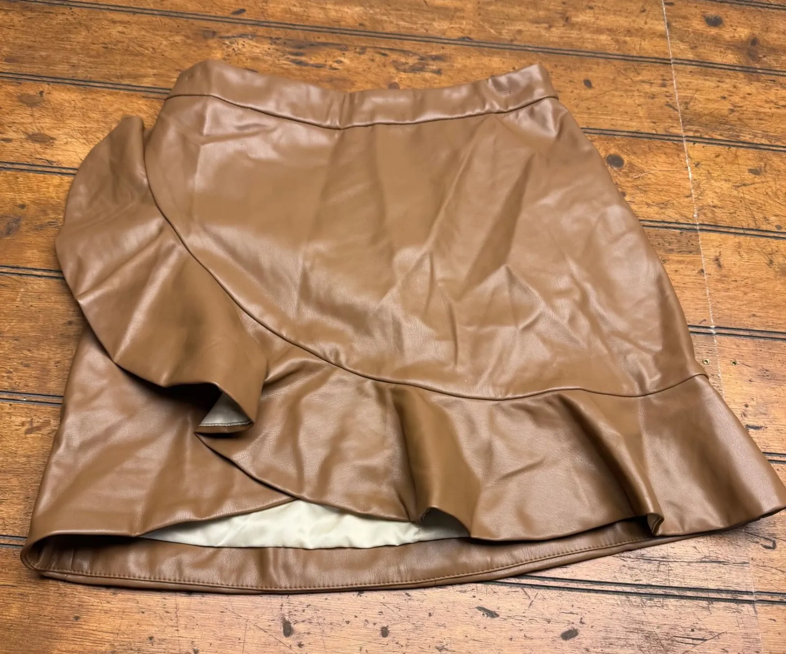 Capture chic sophistication with this Bluiivy faux leather skirt. The luxurious texture of the faux leather drapes beautifully, enhanced by a playful ruffle detail that adds dynamic movement and a touch of feminine flair. A convenient back zipper ensures a smooth fit and easy wear. This skirt is perfect for elevating your look for a stylish brunch or a sophisticated evening out. Type: Skirt Style: Wrap Skirt Length: Short Department: Women Material: Faux Leather Pattern: Solid Accents: Ruffle, Zipper Features: Lined, Asymmetric Closure: Zip Occasion: Casual, Party/Cocktail Keywords: faux leather skirt, ruffle skirt, mini skirt, brown skirt, wrap skirt, flounce detail, contemporary, vegan leather, chic, fashionable, trendy, evening wear, day to night