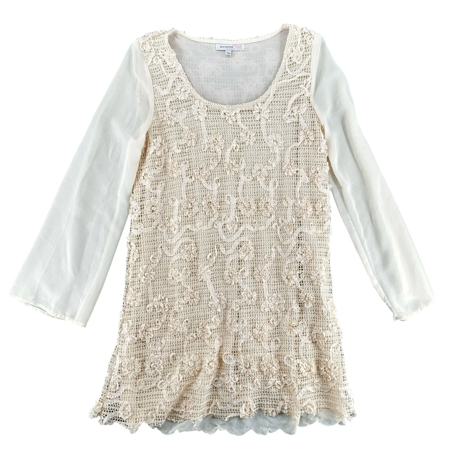 Blu-Pepper White and Cream Lace Crochet Shift Dress Long Sleeve Lined Sheer Women's small Great pr... Show more