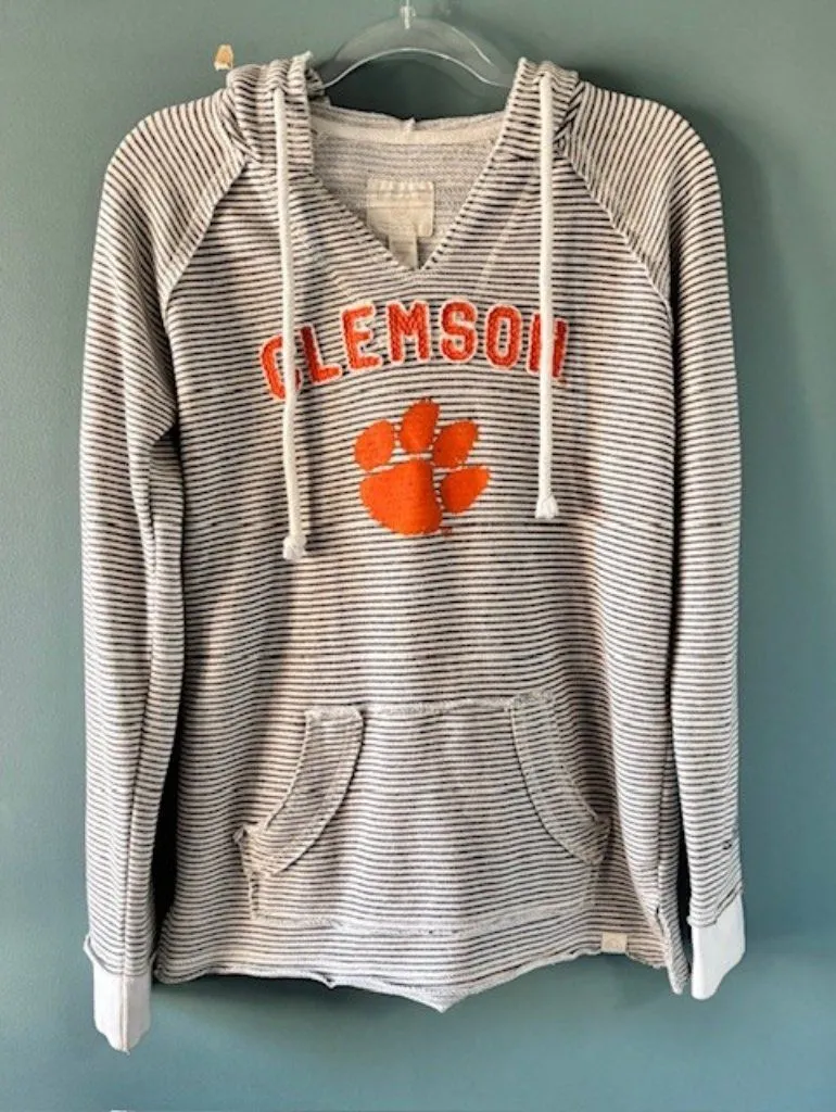 The Blue 84 Clemson Tigers Hooded Sweatshirt in size M is a stylish and comfortable piece of fan apparel perfect for women who want to show their support for the football team. The gray and white stripes add a touch of athleisure style while the hooded design keeps you warm during chilly weather. Made in Pakistan, this sweatshirt is a must-have for any Clemson Tigers fan looking to add a sporty outfit to their collection. Casual. Warm. Athleisure. Campus. Fanwear. Lounge. Spiritwear. 60% Cotton 40% Polyester. 19 inches under arm to under arm 27 inches from neck to end of sleeve 26 inches in length.
