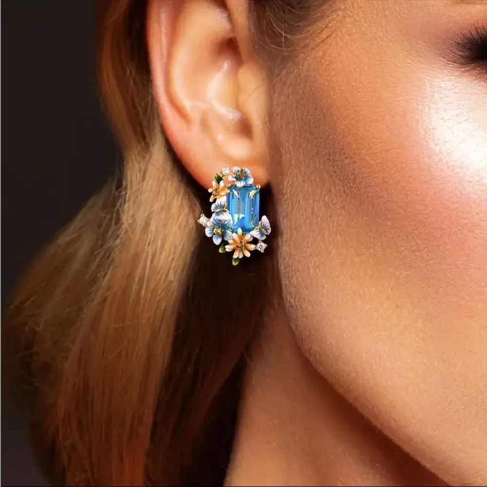 Brand new with tags elegant blue and gold floral stud earrings, featuring a luminous blue crystal ce... Show more