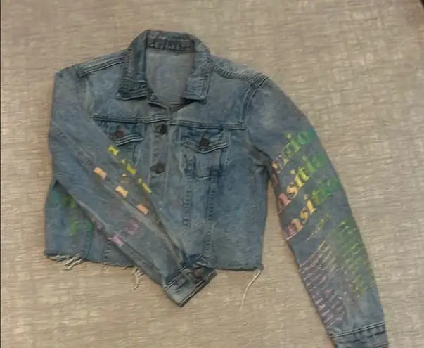 This vibrant jean jacket features a cropped design with eye-catching blue and pink hues. The decorat... Show more
