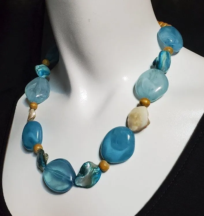 Blue and tan beaded necklace, some of the beads are mother of pearl. Length: 18" - 21" Most jewelr... Show more