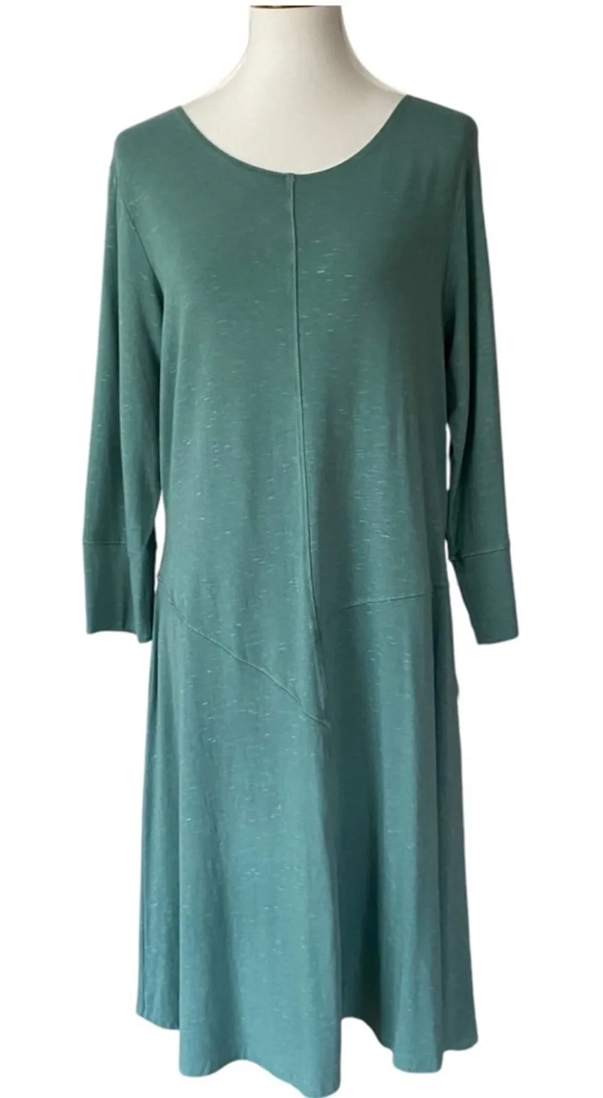 Made in the USA - San Francisco Flatters just about every body type and works for just about every occasion. It's great with boots in the fall / winter, and sandals in the Summer. You just can't find a better all around dress. FEATURES -Size XL -Green with a slight blue undertone -Flecked Pattern throughout -Easy fit -Flattering shape -3/4 length sleeves -Machine wash cool, line dry, cool iron if needed -Please see photos for approximate measurements. Search loungewear athleisure easy travel weekends comfy cozy stretchy staple chic comfortable preppy weekends Spring Summer Fall Winter cruise vacation vacay Preppy chic simple comfy Fall autumn transitional minimalist Granola Bohemian Simple Plain cruise resortwear