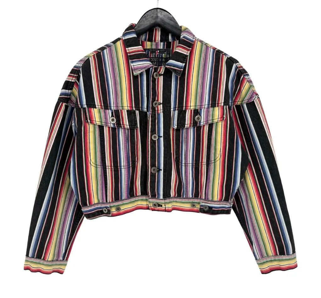 Collar with button down front Branded buttons Two button flap pockets at chest Cropped length Buttons at waist to cinch Drop shoulder Long sleeves with button cuffs 100% cotton denim Vintage, 90s, Y2K, Dopamine, Colorful, Maximalist Excellent condition Size: Medium (46) Bust: 22.5" Length: 16" Shoulders: 19" Sleeves: 21.5" Bottom Hem: 17.5"