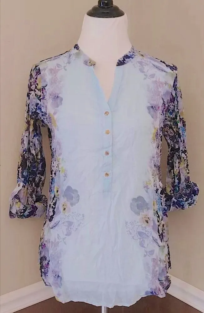 Magazine Brand "A Baker's Denizen" Top. Very lightweight semi-sheer fabric. Light blue with multi-color floral print on the sleeves and down the sides that fades into the front and back of the bodice. Button front. Tab sleeves. Shell: 100% Cotton. Fabric does not stretch. Unlined. New with tags Sold Out at Modcloth Size XS-runs large, fits like small and has a loose fitting silhouette. Shown on a size medium mannequin. Approximate measurements are taken across the item laid flat: Bust: 19 inches Length: 26 inches Clean, smoke-free home and studio. 5 star seller. Super fast shipping! Feminine, fairy, delicate, lace, dreamy, girly, flowy, soft, romantic, dreamy, dopamine dressing, graceful, ethereal SKU#B1546 22B