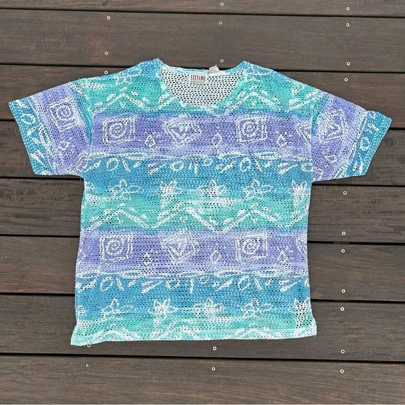 Beach Cover #crochet ▪️ good used condition w/ some discolorations as pictured ➡️ Colors may vary slightly from pictures! ⬅️ 🔳 Size: women’s Medium 🔳 Brand: Stefano International MEASUREMENTS: in pictures! Grunge - Soft - Vintage - Y2K - Early 2000s - Embroidered - Detailed - Boho - Bohemian- Beachy - Neutral - Earth Tones - Minimalist - Old Money Vibrant crochet top with short sleeves. Features a mix of blue, teal, and white patterns.