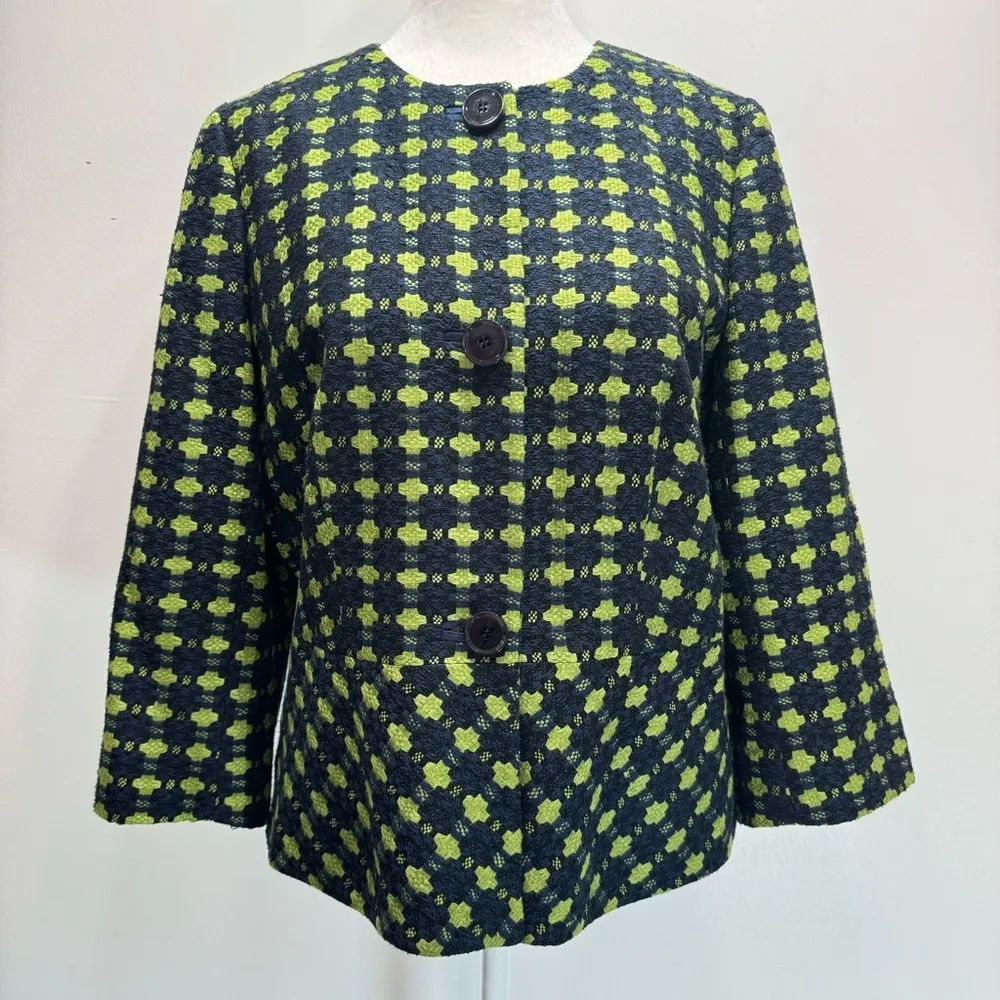 Austin Reed Navy Blue & Lime Green Woven Silk Blend Collarless Button Front Peplum Jacket. Long sleeves. Fully lined. Quality constructed classic and timeless jacket. Perfect weight for layering in cooler weather. Very classy addition to any wardrobe. Women’s size 10 Brand new with tags Clean, smoke free home and studio. Five star seller. Super fast shipping! Measurements 20” armpit to armpit 23” length *measurements are approximate Dark academia, tailored, intellectual, preppy, collegiate, classic, timeless SKU# 2451152 49