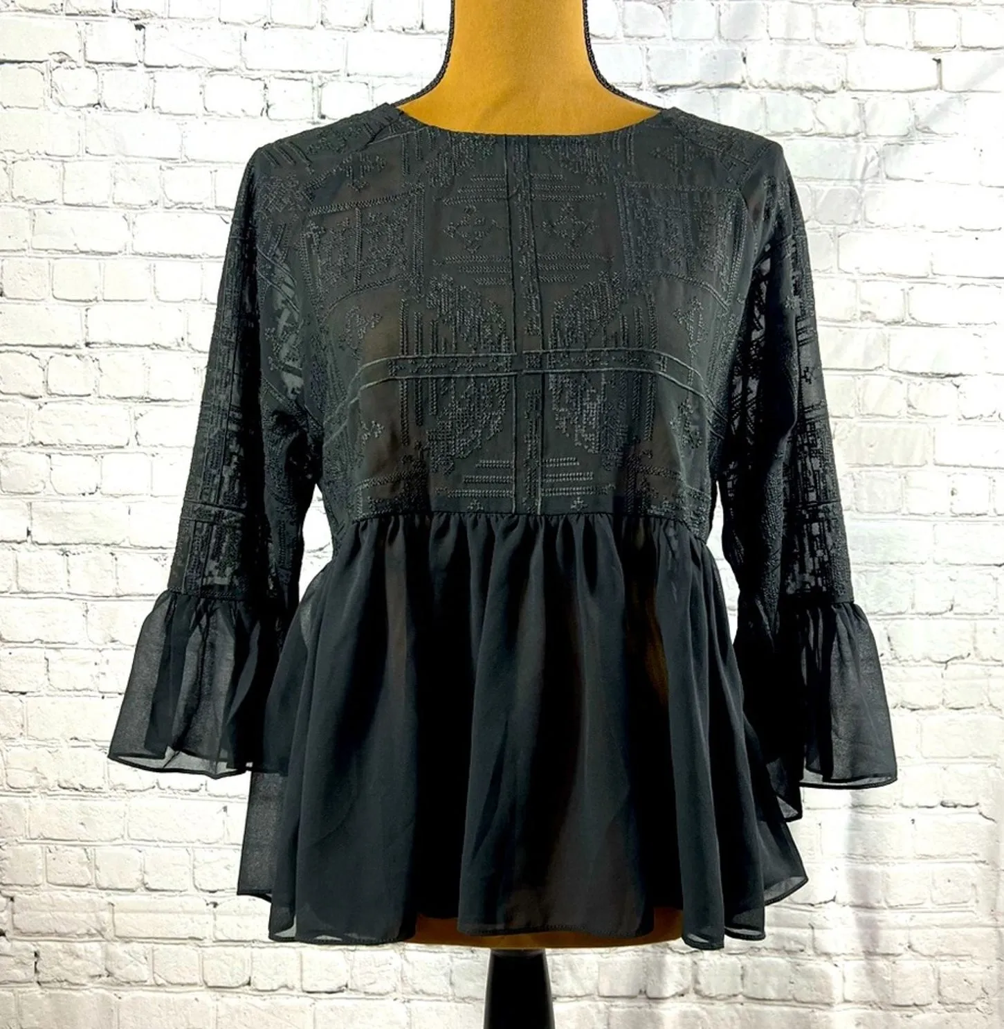 This is a beautiful BoHo Top from Blue Rain. It features an intricate patter on the top and sheer fl... Show more