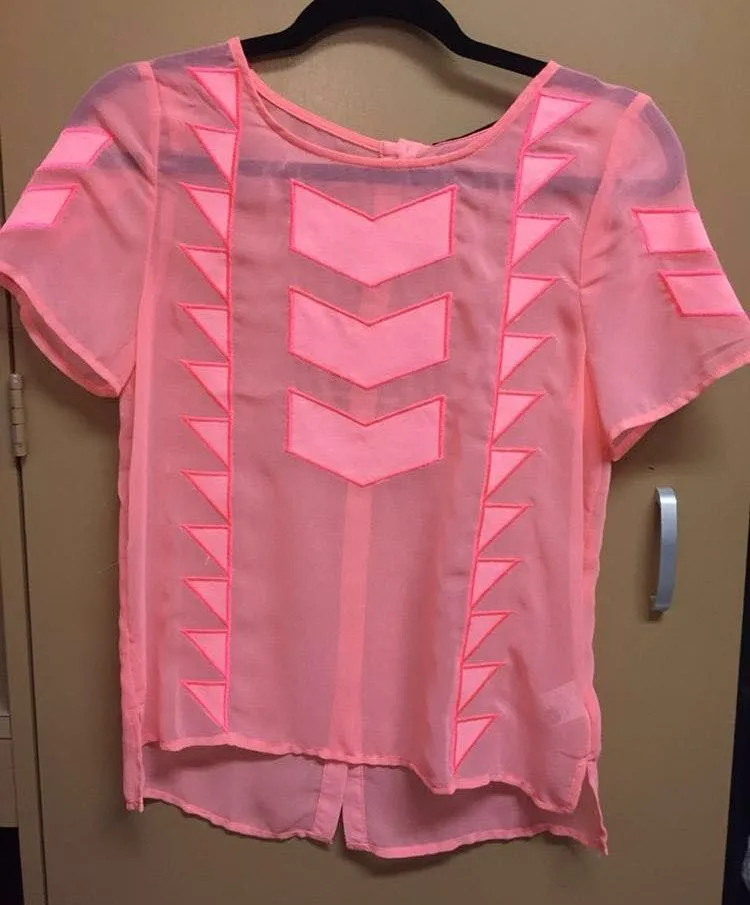 Pink/salmon color, Aztec style print/embellishments, sheer, shirt, back buttons to close Fits true t... Show more