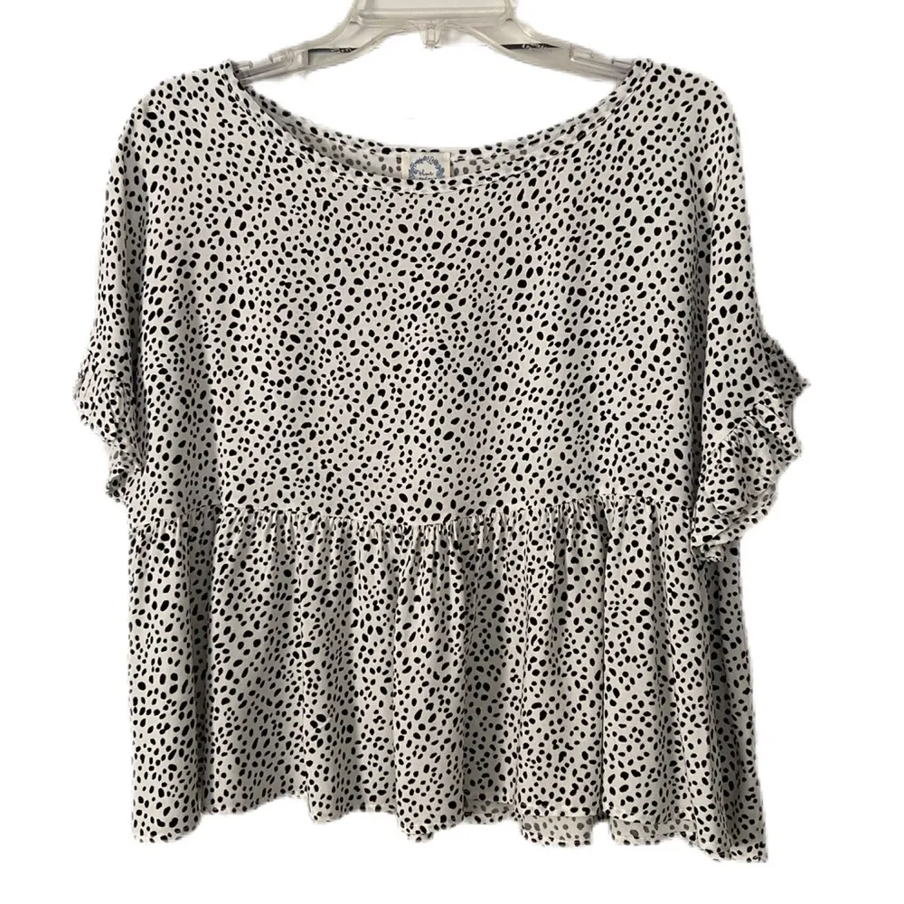 Stylish and comfortable, this black and white spotted cropped peplum top is perfect for any occasion... Show more