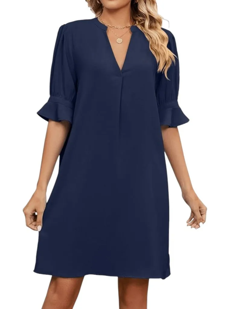 Blue shift dress with slit neckline, lightweight fabric, and ruffle detail on the sleeves. Falls at... Show more