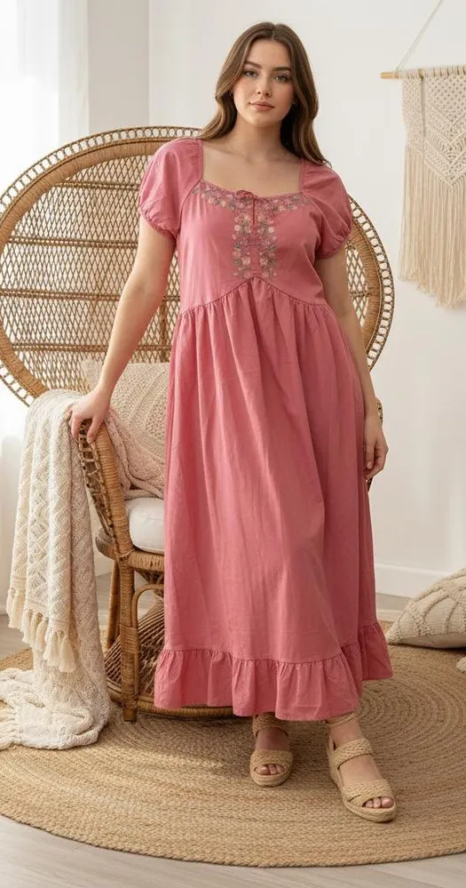 Size: XL Approximate Measurements: Pit to Pit 19”, Length 44” Brand: Blueberi Boulevard Material: 58% cotton, 42% rayon — soft and breathable Style: Coral pink milk-maid style midi dress featuring puff sleeves, square neckline, floral embroidery on the bodice, smocked back, and a tiered ruffle hem. Condition: Pre-owned and in excellent condition; no visible stains, pulls, or snags. Care: Machine wash cold, line dry or tumble dry low. Why you’ll love it: The Blueberi Boulevard Embroidered Milk Maid Dress blends romantic charm with effortless comfort. Its puff sleeves and embroidered detail add a boho feel, while the smocked back ensures a flattering fit for any occasion. #BlueberiBoulevard #MilkMaidDress #EmbroideredDress #PuffSleeveDress #VintageInspired #RuffleHemDress #CottageCoreDress