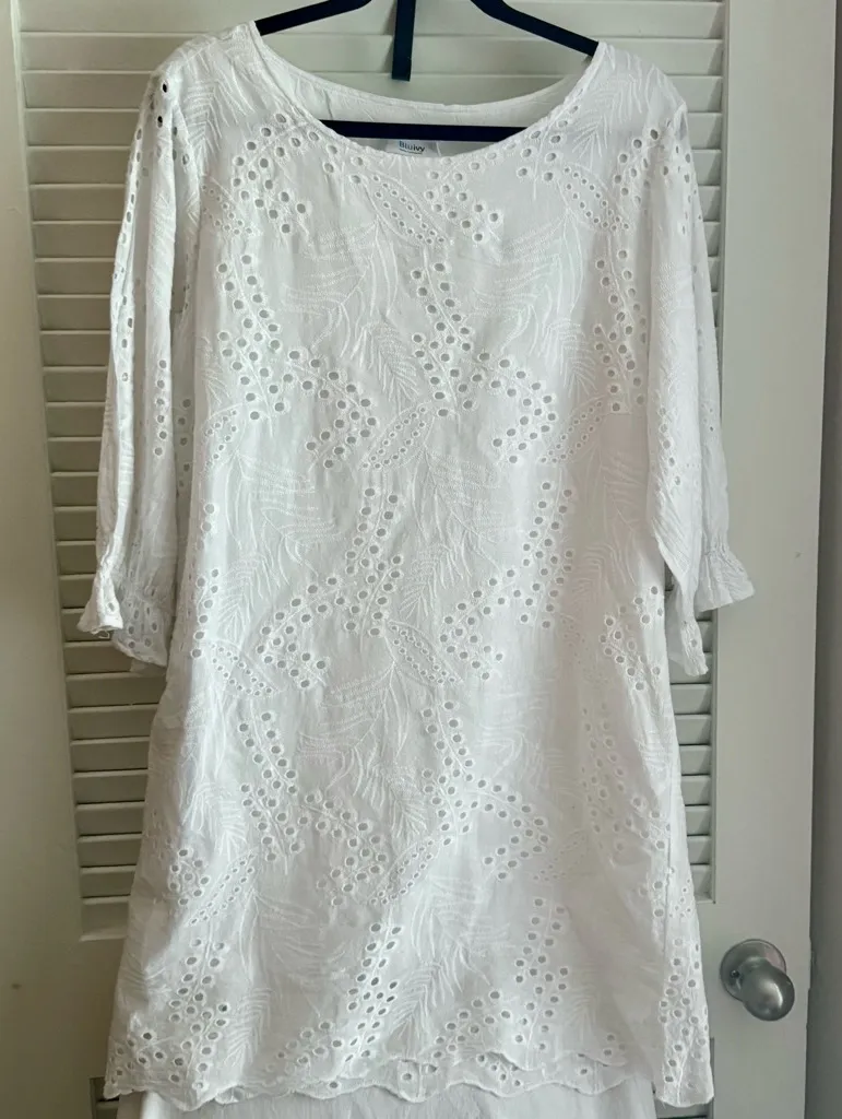 This gorgeous, romantic & feminine Bluivy shift dress is 100% cotton & features beautiful all-over eyelet embroidery. I’m estimating the size as XL as I can’t find a size tag on it (the 21” pit-to-pit width matches Bluivy’s 41-42” bust chart size for the XL). It’s in excellent used condition otherwise. The dress has a classic shift silhouette, three-quarter length bell sleeves, scalloped hem, boat neckline, and is fully lined (see pics as part of the description) Measurements: Length: 35” Pit-to-pit: 21” Cottagecore, boho, romantic, feminine, prairie, eyelet, embroidered, fairy, grandma