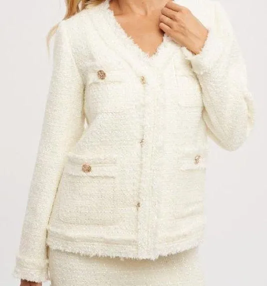New With Tags Women’s Small 80%ACRYLIC,20%WOOL Gorgeous tweed jacket featuring a gold buttons detail, collarless, frayed edges, front pockets, long sleeves, relaxed fit, fully lined. Gold Cream Sparkle Wool Blend Overcoat Raw Frayed Fringe