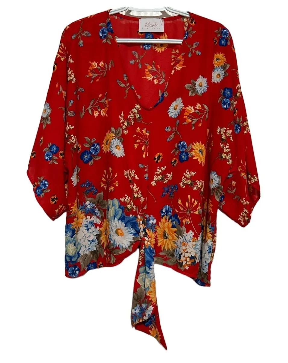 Blush Boutique Women's Red Floral Waist Tie V-Neck‎ Short Sleeve Blouse Size L Size L - $15 - From Bonnie
