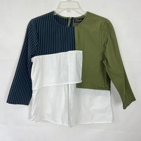 Women's color block patched top. Blue, white, and green. Front slit. 3/4 sleeves. Hidden zipper in b... Show more