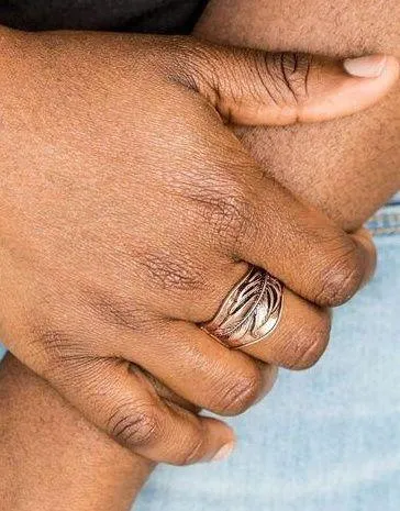 Features a thick copper band with an embossed feather design and has a stretchy band for a flexible... Show more