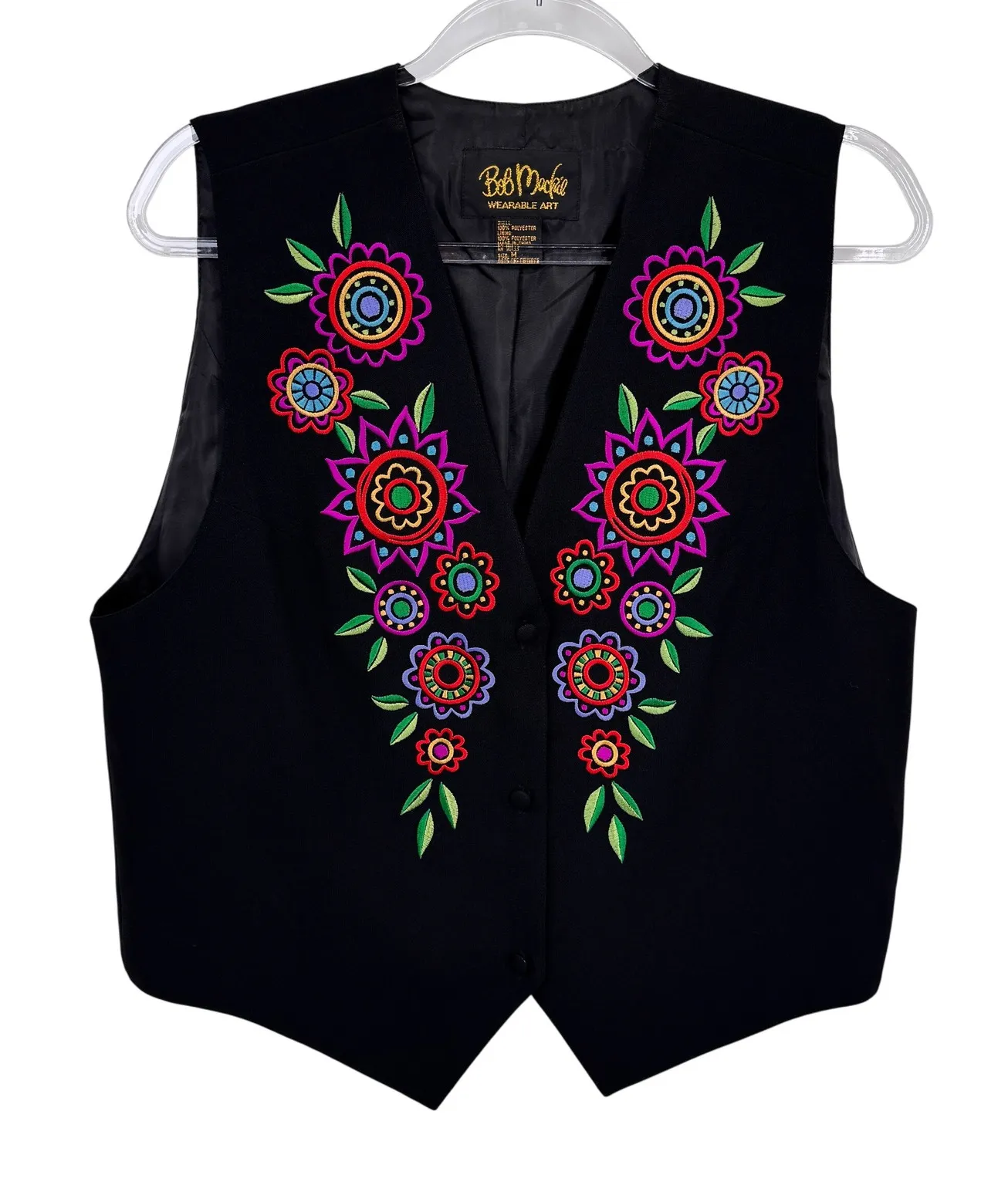 Black beauty blooms in this vintage Bob Mackie Wearable Art vest, where dark sophistication meets vibrant, floral fancy. Imagine yourself turning heads as you enter a room, the intricate embroidered flowers catching the light and adding a touch of personality to your outfit. This sleeveless top exudes confidence and fun, making it a unique statement piece for any wardrobe. Perfect for adding a pop of color to a monochrome ensemble, or for layering under a jacket for extra warmth and style. Pair it with a sleek black dress for an evening out, or with jeans and boots for a touch of Western flair. Color: Black Type: Vest Department: Women Style: Basic Material: Polyester Neckline: V-Neck Sleeve Length: Sleeveless Accents: Embroidered, Button Pattern: Floral Features: Wearable Art, Lightweight, Collarless, Sleeveless Fit: Regular Approximate Measurements Laying Flat Across: Chest: 20 inches Length: 25 inches Excellent preowned condition - no rips, stains, or tears. From a smoke free, pet friendly home. Approximate measurements in description. Seller Notes: -Same/Next Business Day Shipping -Smoke Free & Pet Friendly Home Keywords: Bob Mackie, Wearable Art, Vest, Black Vest, Floral Vest, Embroidered Vest, Sleeveless Top, Vintage Vest, Bohemian Vest, Retro Vest, Medium Vest, Womens Vest, Designer Vest, Statement Piece