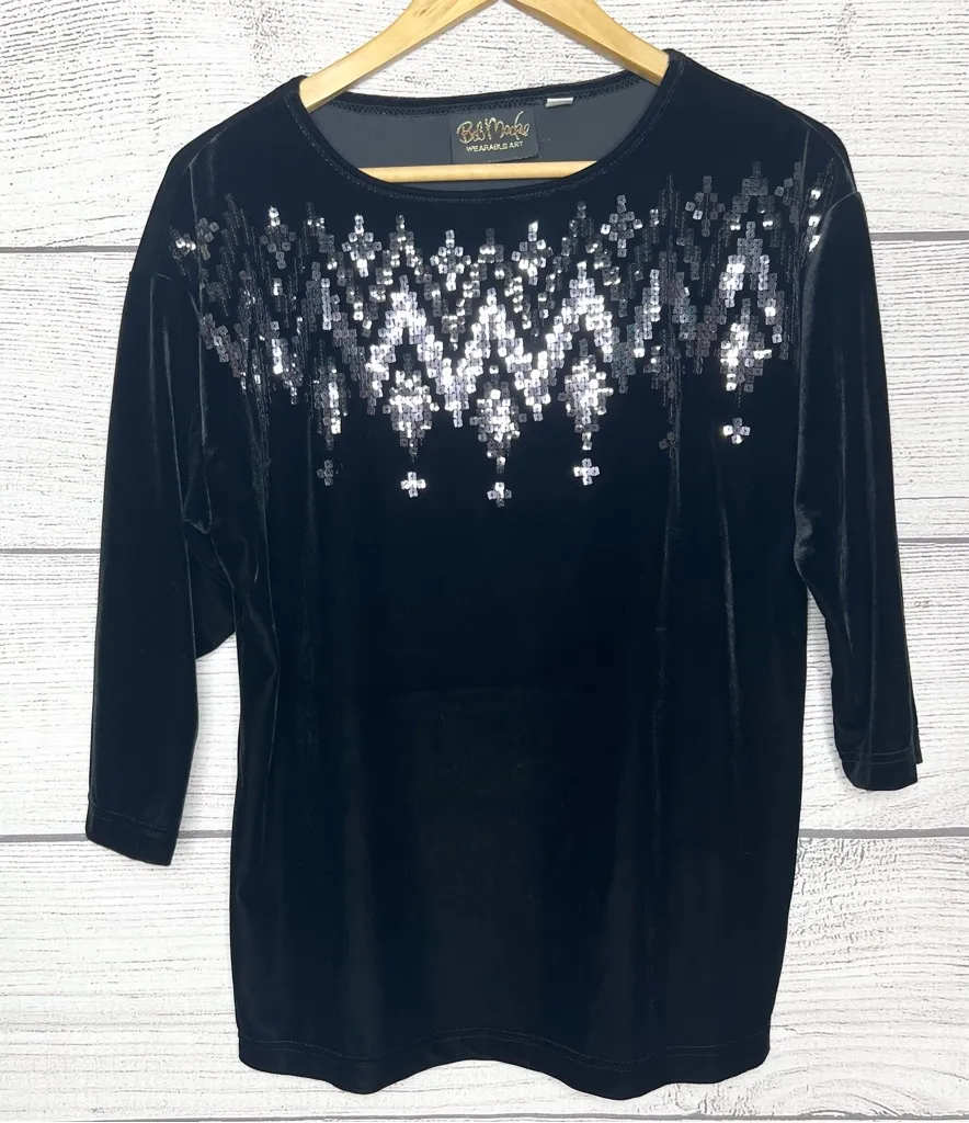 Bob Mackie Wearable Art Black Velvet & Sequin Sweater Top Blouse Women’s Size XS Approximate flat... Show more