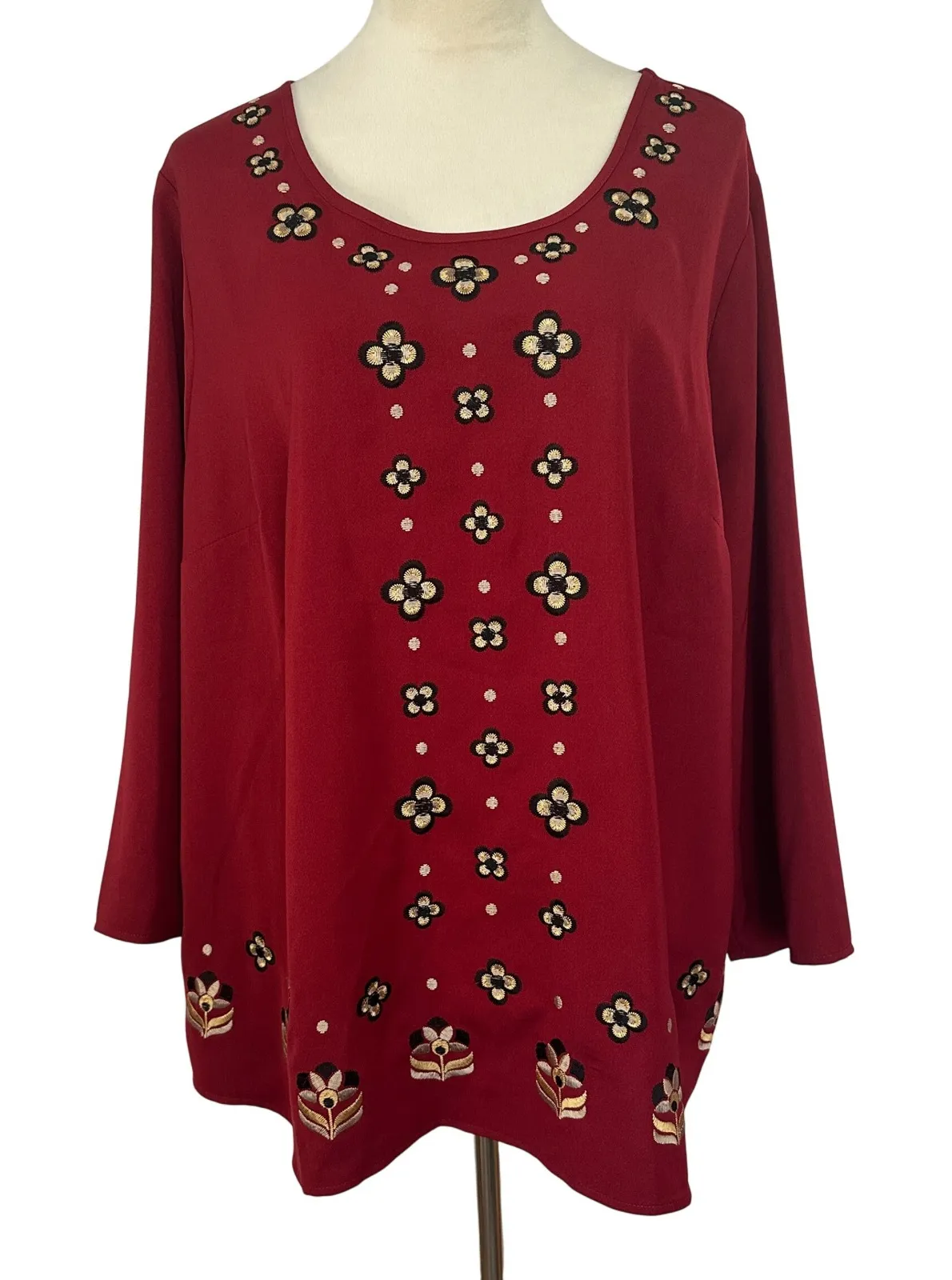 A flourish of artistry awaits with this Bob Mackie Wearable Art top. The rich red hue serves as a canvas for the intricate floral embroidery that graces the neckline, front panel, and hem. Each stitch tells a story, creating a tapestry of texture and visual interest. The round neckline and long sleeves offer a comfortable and flattering fit, while the overall design exudes a sense of effortless elegance. This top is perfect for adding a touch of sophistication to a casual brunch, elevating your everyday style, or making a statement at a relaxed evening gathering. Excellent preowned. Style: Tunic Neckline: Round Neck Sleeve Length: Long Sleeve Sleeve Type: Classic/Fitted Sleeve Accents: Embroidered Pattern: Floral Features: Round Neck, Lightweight, All Seasons, Comfortable Fit Fit: Relaxed Keywords: Bob Mackie, Wearable Art, Embroidered Top, Floral Blouse, Red Top, Plus Size, 1X, Boho, Bohemian, Elegant, Casual, Long Sleeve, Round Neck, Designer Top