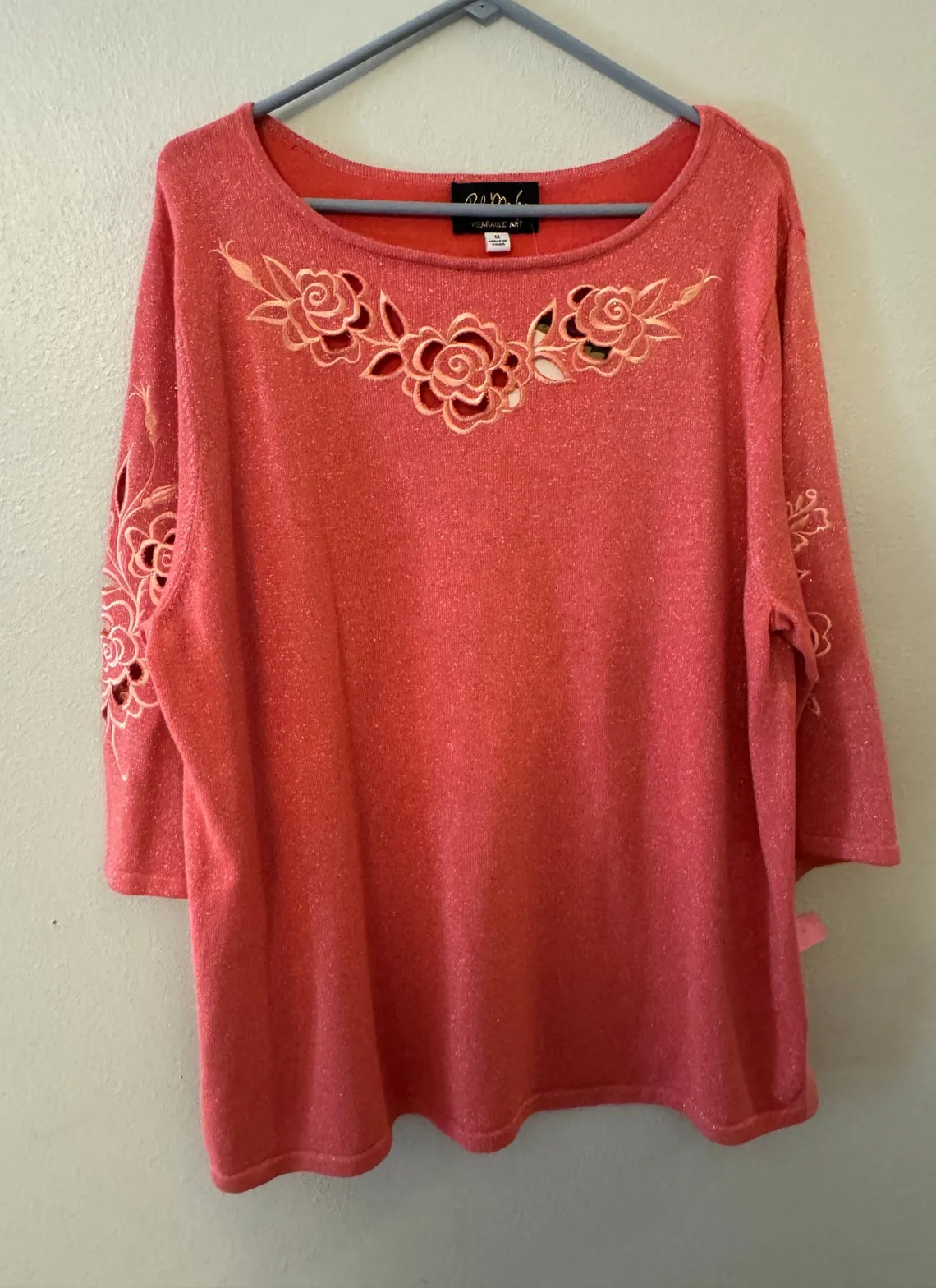 Sweater is new with tags. No flaws. Beautiful cut outs and metallic thread throughout. Measures 26 inches pit to pit, 27 inches long and sleeves 18 inches. Open to offers. Ships next day.