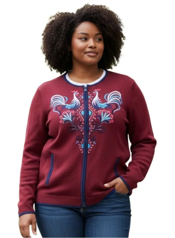 Bob Mackie Wearable Art Full Zip Cardigan Burgundy Navy Embroidered ROOSTERS - $45 - From Christine