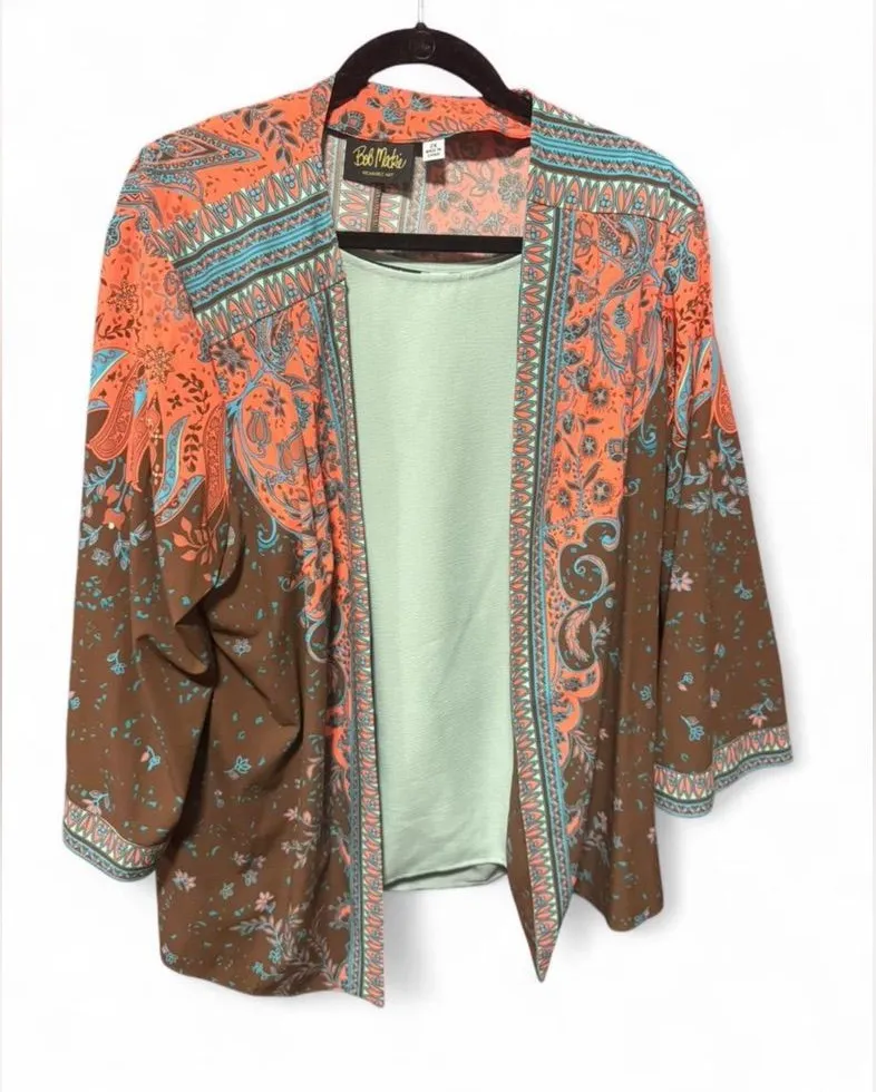 Coverup 31” long Bob Mackie Wearable Art open-front kimono-style top with a matching inner shell. This style, often referred to as "wearable art," features a bold, artistic print combining paisley and floral motifs in shades of orange, brown, and blue/teal. Product Details * Brand: Bob Mackie Wearable Art * Style: Kimono, Duster, or Open-Front Jacket with an included inner shell/tank top * Print: Paisley and floral patterns * Colors: Predominantly orange and brown, with blue/teal accents * Sleeve Length: 3/4 length Bob Mackie Wearable Artsleeveless shell or tank top in a sage green or celadon color. It features a scoop or round neckline and appears to be made from a polyester and spandex blend knit or woven crepe fabric. Green 25” pit to pit 27” long