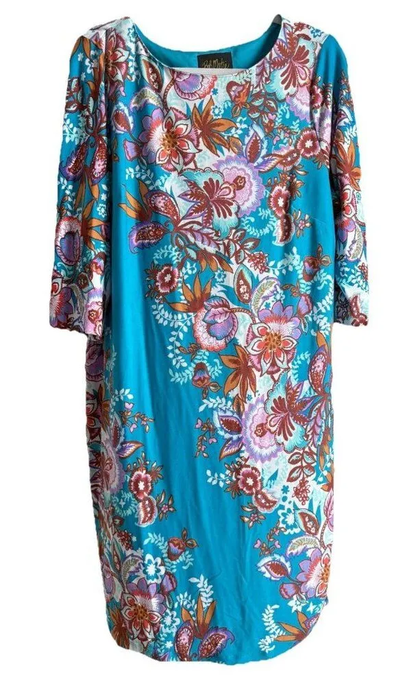 This colorful Bob Mackie dress features a paisley floral pattern with a round neckline and 3/4 cap sleeves. The pullover closure adds to its casual, yet stylish look. Perfect for various occasions such as travel, parties, and even a cocktail event, this dress is versatile and suitable for all seasons. Dress is in great preowned condition. Length 41” Bust 21” Sleeves 18” Size Large