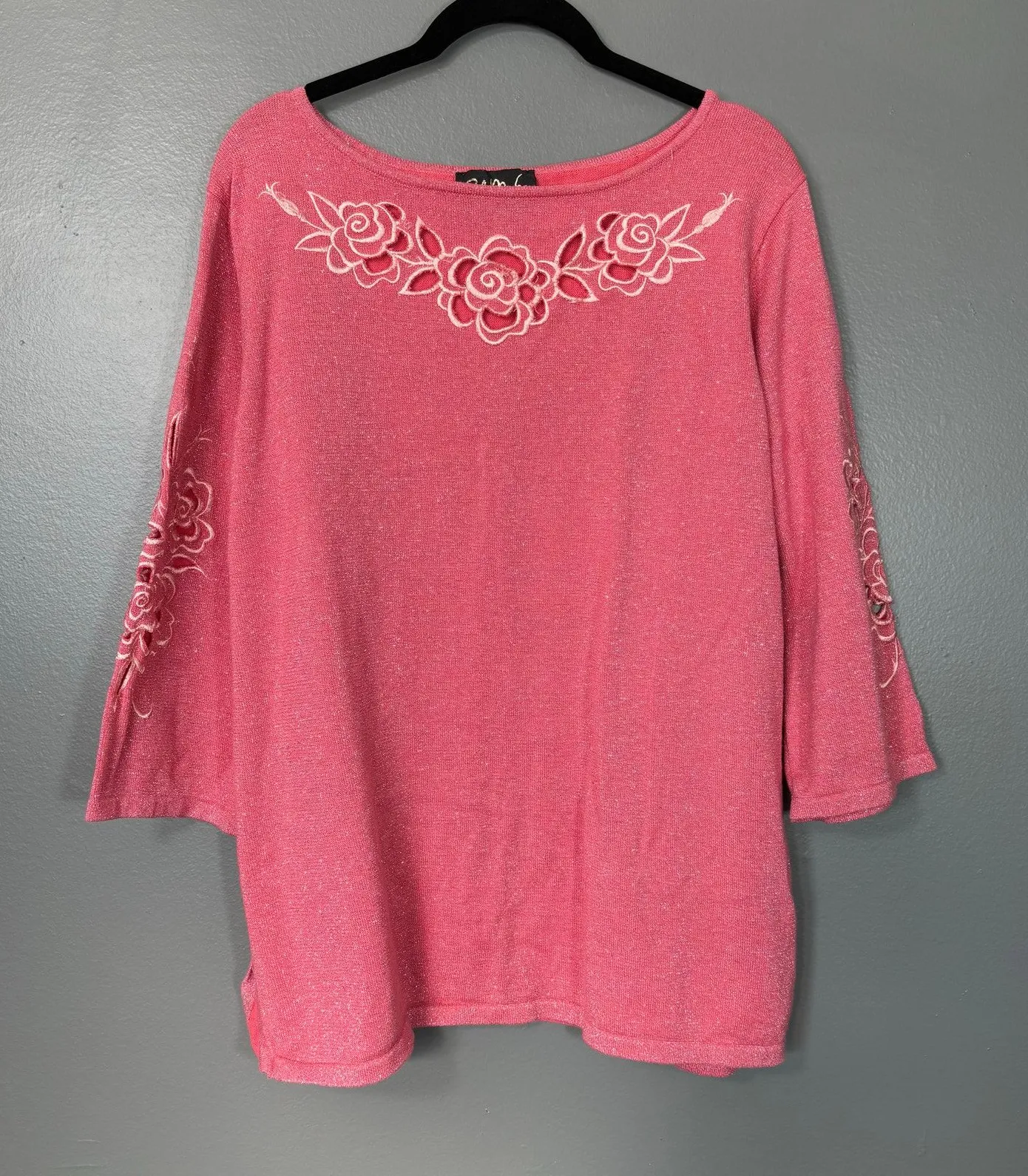 Women's coquette grandmacore embroidered sweater by Bob Mackie Wearable Art. This dark pink knit top has embroidered flowers with small cutouts, 3/4 length sleeves, a silver glitter metallic thread woven in, and a boat neck. It is a cotton, polyester, metallic blend. The sweater is a size XL. When laying flat it measures approximately: Armpit to armpit: 24 inches Length: 28 inches The sweater is in amazing shape.