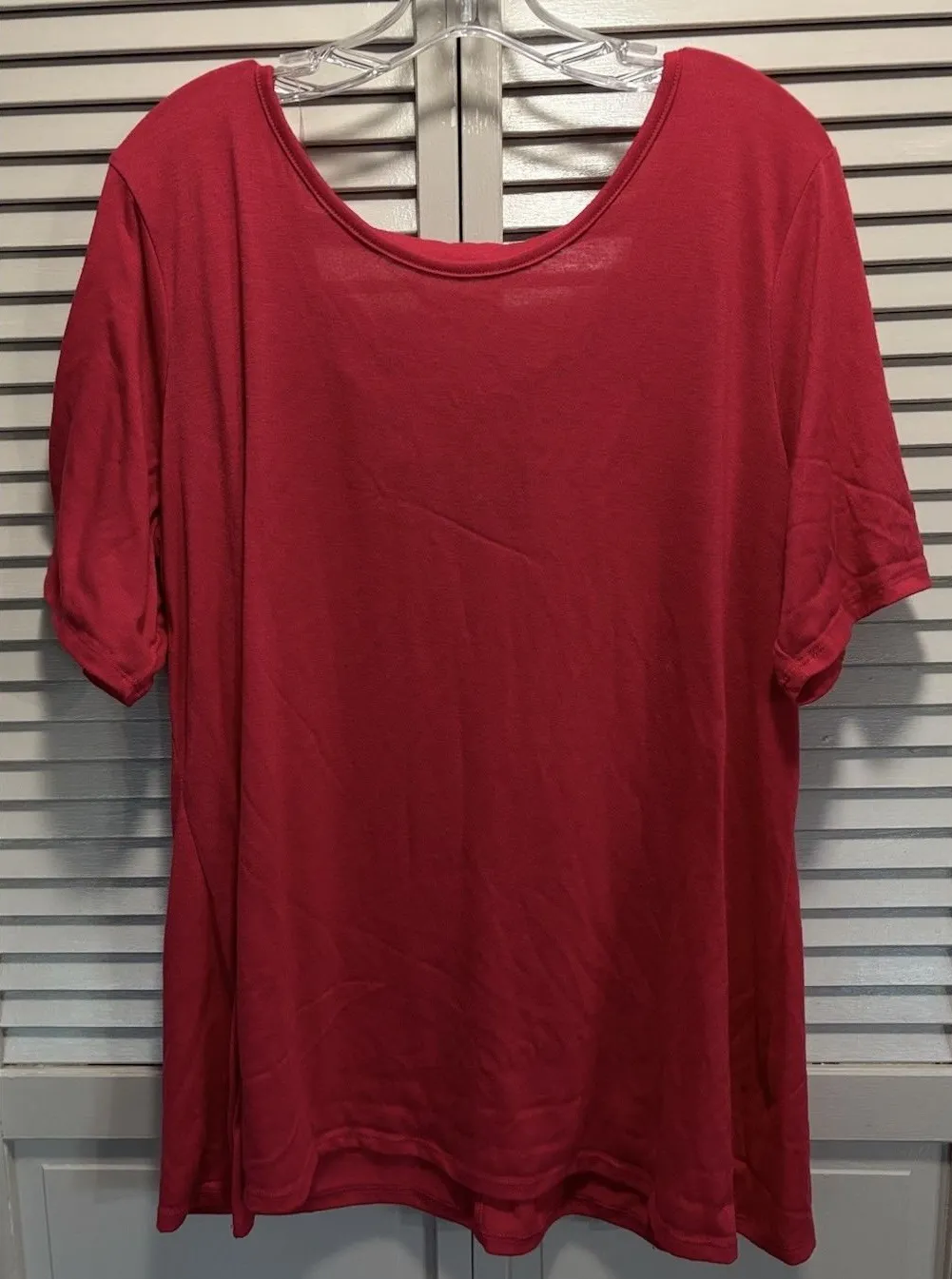 The Bobbie Brooks Pink Short Sleeve Top in size 3XL is a stylish and comfortable boho flowy top perfect for various occasions such as travel, parties, casual outings, and workwear. It is 23.5" pit to pit and 29" length. This lightweight blended fabric top features a scoop neckline and an open strappy back, making it versatile for all seasons. With a pullover closure and easy-care instructions, this top is a practical and colorful addition to any woman's wardrobe. The basic style and solid pattern of this blouse make it a classic choice for any fashion-forward individual. (3083)