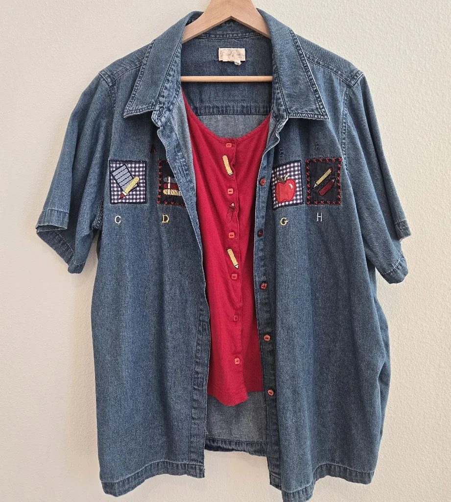 Bobbie Brooks Vintage Apple Pencil school denim button down shirt size XXL Blue - $25 - From Miriam