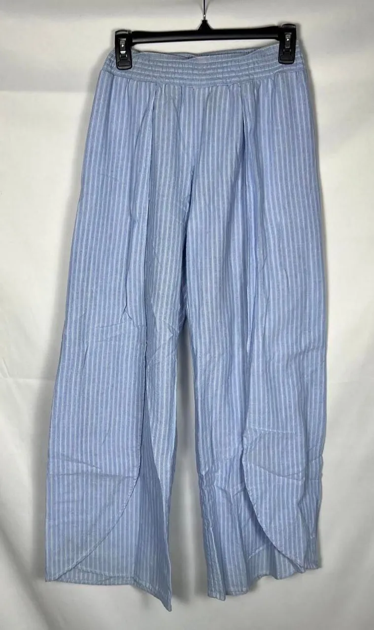 Embrace effortless summer chic with these gorgeous wide-leg pants from bobi Los Angeles! Made from breathable 100% Cotton in a soft blue and white pinstripe pattern, these pants feature a super comfortable smocked, high-rise elastic waistband and a trendy tulip/overlapping split hem. Perfect for beach trips, resort wear, or a breezy casual look. Details: • Brand: bobi Los Angeles • Size on Tag: XS • Color: Light Blue and White Pinstripe • Material: 100% Cotton Measurements (Laying Flat): • Waist (Flat, Un-stretched): 11” unstretched • Rise: 9” • Inseam: 30” • Length (Waistband to Hem): 38” #bobila #wideleg #pinstripe #resortwear #beachpants