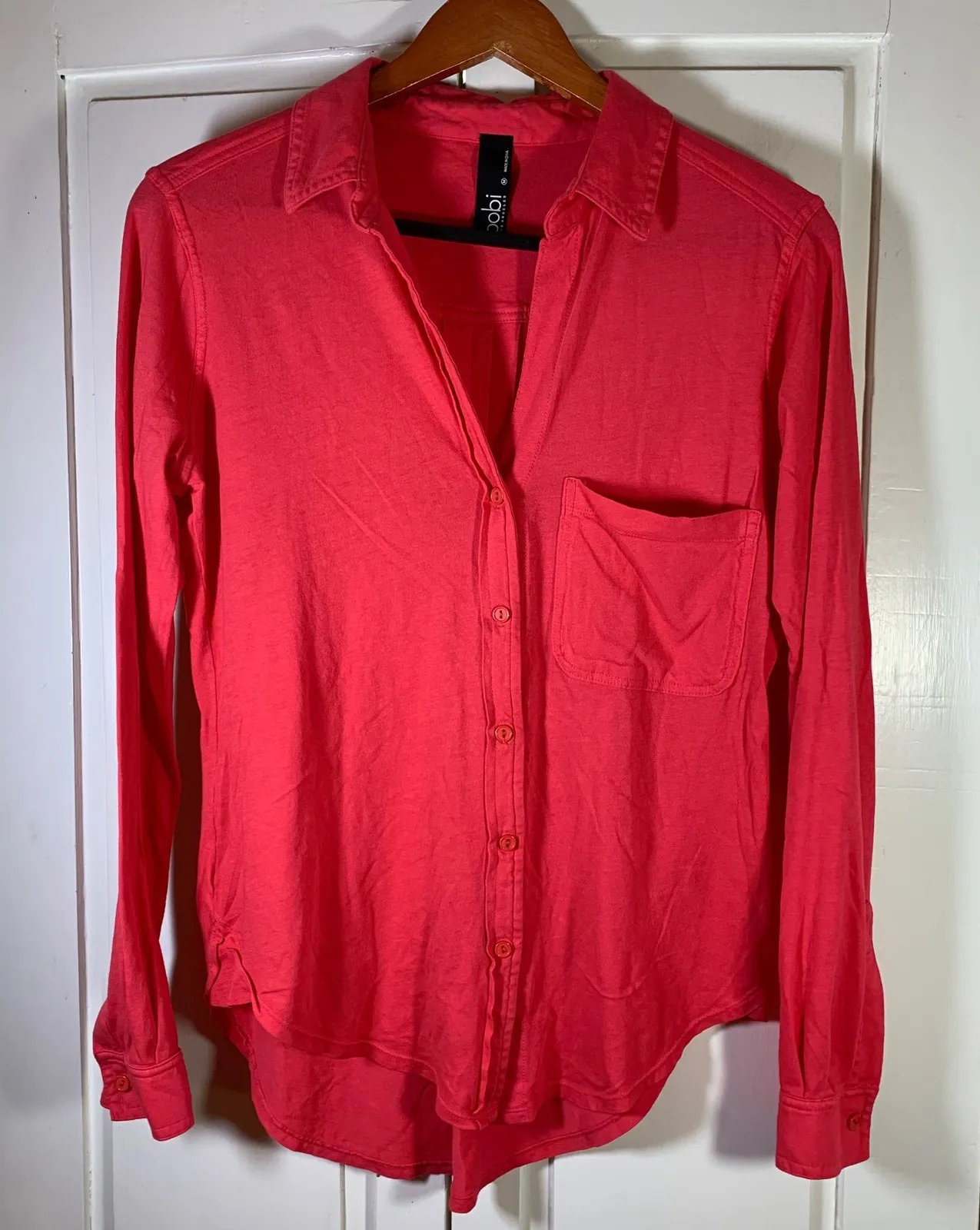 A coral red long sleeve button-up shirt from bobi Los Angeles. This classic collared shirt features a single chest pocket, button cuffs, and a high-low hemline. The relaxed fit and soft fabric make it perfect for casual outings or layering. Tiny flaw (spot) on one sleeve - see photos. minimalist, laidback, softcore, capsule wardrobe, cozy core, california casual, classic red, quiet luxury, throw-on top, normcore, comfy chic, off-duty model, 2010s revival, preppy, schoolcore Bobi Los Angeles, button front, red shirt, lightweight cotton, casual top, minimalist, layering shirt, everyday basics, closet staple, made in China, women's size M, classic cut, relaxed fit Type: Button-Up Department: Women Style: Tunic Material: 100% Cotton Neckline: Collared Sleeve Length: Long Sleeve Sleeve Type: Classic/Fitted Sleeve Pattern: Solid Accents: Button Features: Stretch Fit: Regular Keywords: bobi, coral, pink, button up, long sleeve, cotton, casual, everyday, layering, minimalist, basic, womenswear