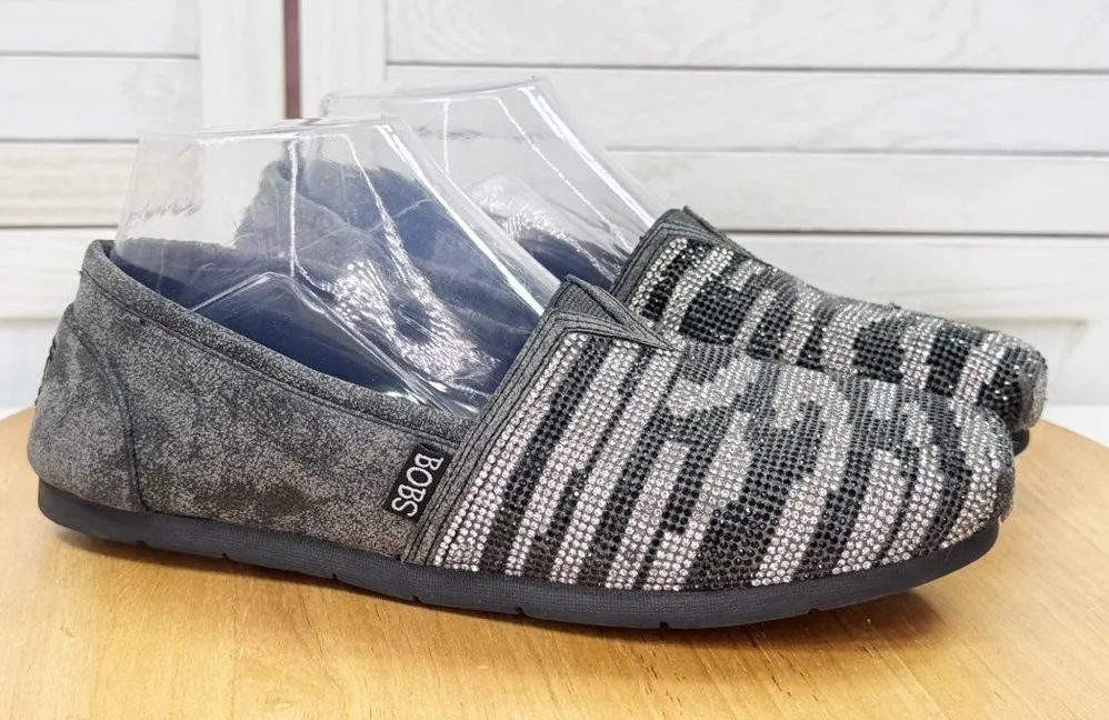 Bobs from Skechers Luxe Lily Love Rhinestone Camo Faux Leather Flats Size 8 Silver & black camouflage rhinestone foot Faux leather heel Closed round toe Slip on Flat Textured rubber sole Excellent preowned condition #”