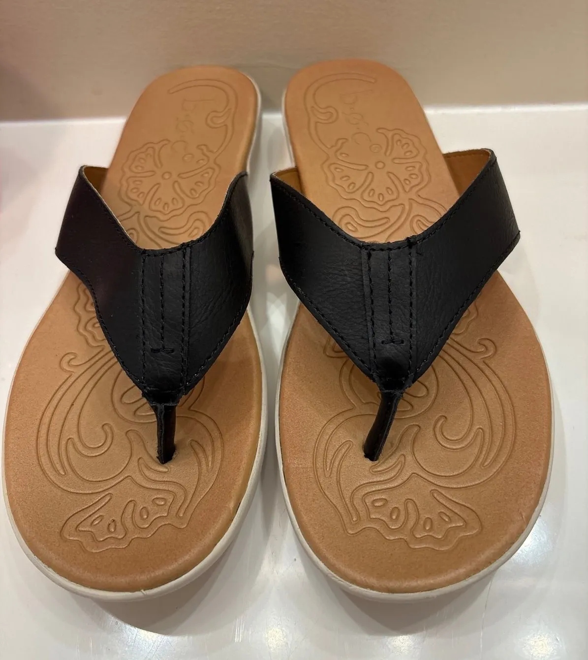 Step into ultimate comfort and style with these chic black leather wedge flip-flops. The supple leather straps embrace your feet, offering a secure yet relaxed fit for all-day wear. Designed with a contoured footbed adorned with an elegant floral embossed pattern, these sandals provide exceptional support and a touch of artisanal charm. The substantial yet lightweight wedge sole offers a comfortable lift, making these perfect for everything from casual strolls to vacation adventures. Elevate your warm-weather wardrobe for a leisurely brunch, a day at the beach, or a relaxed evening out. Very good condition. Barely worn. Measurements: • Heel Height: 1.75 in • Platform Height: 1 in Style: Flip Flop Department: Women Upper Material: Leather Heel Style: Wedge Features: Arch Support, Padded, Orthopedic Closure: Slip On Pattern: Floral Accents: Logo Heel Height: Mid (2-2.9 in) Type: Sandal Keywords: Boc Born Concepts sandals, black leather flip flops, wedge sandals women, comfortable sandals, boho sandals, summer shoes, casual sandals, designer flip flops, orthotic sandals, supportive sandals, women's size 7 sandals, floral print footbed