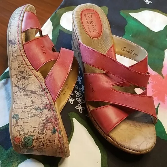 BOC Cork Platform Wedges Red leather upper straps with floral print on cork Size 10 Gently Used Condition; Signs of wear (Please see photos) Add a splash of color to your wardrobe with these casual chic shoes perfect for a spring or summer day outdoors. Comfortable for all day wear. Y2k style 3" Heel Height