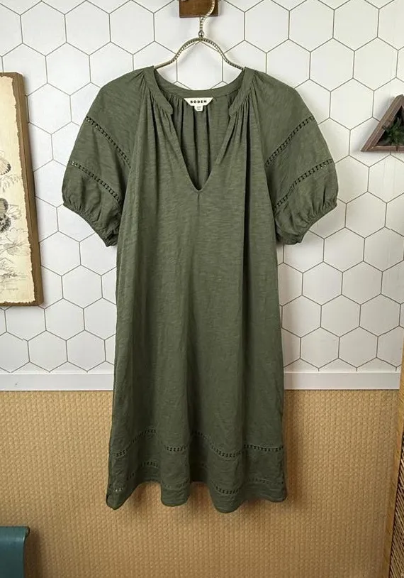 Measurements are approximate and given for reference. P2P: Approximately 19.5 inches Length: Approximately 36 inches Size: 10 Condition: Lightly worn with no visible signs of wear or damage. This olive green dress features a relaxed fit with puff sleeves and delicate cutout details on the sleeves and hem. The neckline has a subtle V-cut for a comfortable and stylish look. Made from a soft, breathable fabric, it is suitable for casual or semi-casual occasions.