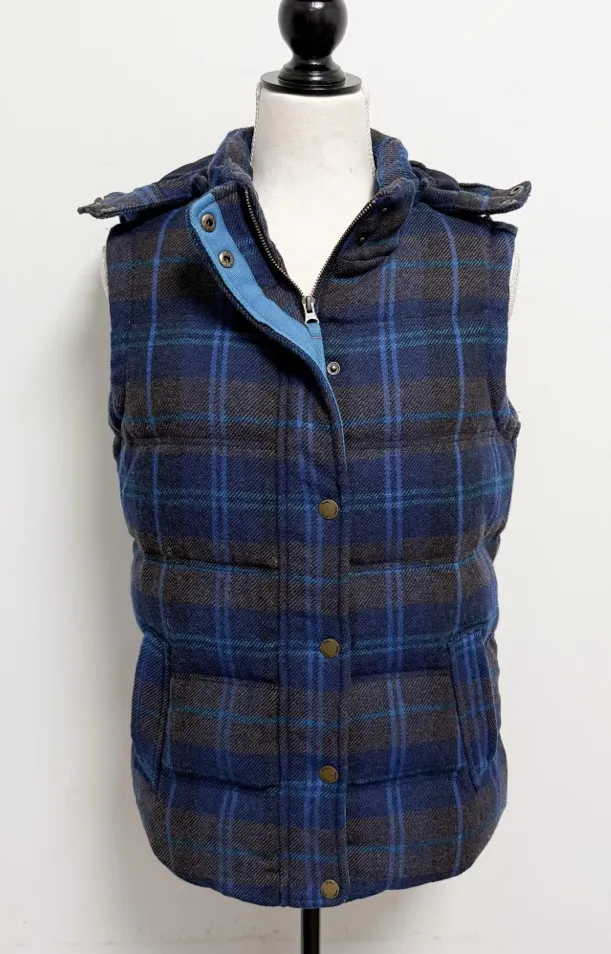 Brand: Boden Size: 6 (please see measurements below) Style: Multiple shades of blue, turquoise blue and brown plaid “Pembroke” vest. Detachable hood. Front zipper and snap button closure. Wool blend with down and feather filling. Burnished gold tone hardware. Dry clean garment care. Condition: There is some minor pilling due to the wool content, most notably in the armpit areas. Some minor scratching on the buttons. There are no rips, stains or loose threads. Approximate measurements when laid flat: 18.5” bust, 18” waist and 24” length from top of shoulder to bottom hem. Please feel free to reach out with any questions prior to purchase. Comes from a smoke free home. I typically ship within 24 hours but please be advised that I do not ship on Saturdays, Sundays or holidays. Thank you for understanding!