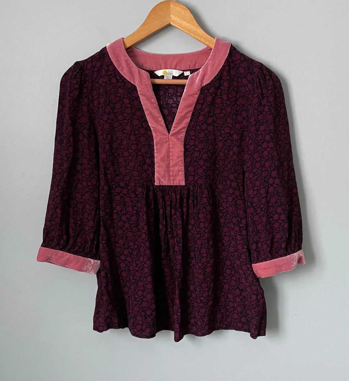 Discover effortless charm in this Boden tunic top. A captivating burgundy base is adorned with an intricate black floral print, while plush pink velvet trim elegantly frames the V-neck and cuffs, adding a touch of sophisticated luxury. The flattering gathered empire waist flows into a relaxed silhouette, offering both comfort and style for any occasion. Perfect for a stylish lunch date or a casual day out. Measurements: • Bust: 38 in • Waist: 38 in • Length: 26 in • Sleeve Length: 17 in Type: Blouse Department: Women Style: Tunic Material: Viscose, Polyester Neckline: V-Neck Sleeve Length: 3/4 Sleeve Sleeve Type: Roll Tab Sleeve Pattern: Floral Accents: Button Features: Collared Fit: Relaxed Fabric Type: Viscose Occasion: Casual, Workwear Closure: Pullover Season: Spring, Fall Keywords: Boden, tunic, burgundy, floral, velvet trim, v neck, three quarter sleeve, womens top, feminine, boho, retro, fall fashion, winter wear, blouse