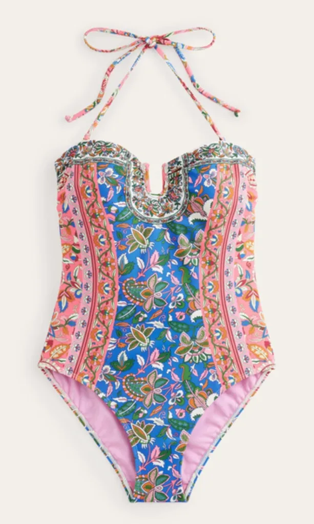 — Gently used, no flaws Pink blue green floral paisley print US 16-18 Long — Long length Lined Built in cups U wire Halter tie neck — Boho beach vacation resort island tropical cruise spring summer coastal