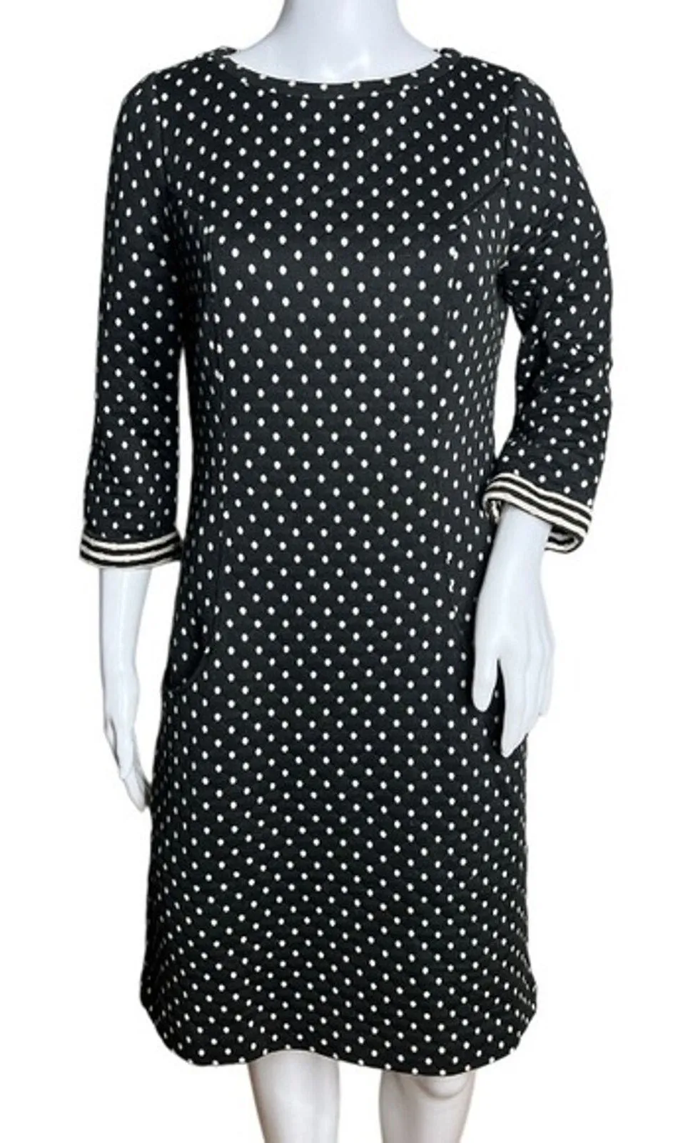 Boden Dress Womens 6L Navy Blue White Polka Dot Sheath Quilted Novelty Bohemian Women’s Size 6L Double Layer 3/4 Sleeve Striped Cuffs Scoop Neck Exposed Back Zip Pockets Polyester Cotton Blend Measurements are Approximate: Length 37” Armpit to Armpit 18” Waist 30” Gently Used Condition. No Rips Tears or Stains (1419)
