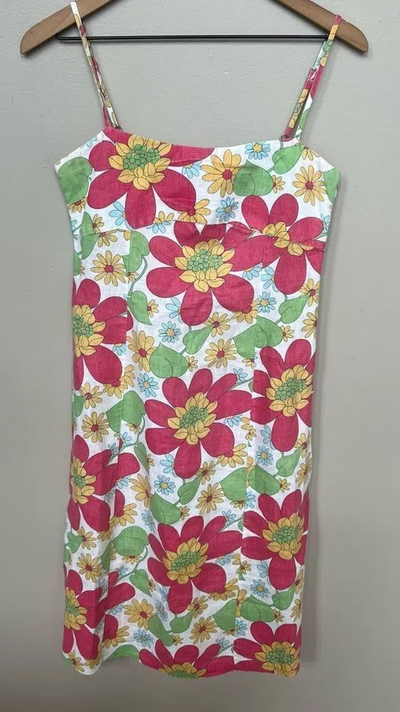 Boden Floral Linen Spaghetti Strap Sundress Resort Wear Size 10E White Pink Green Yellow Flowers... Show more