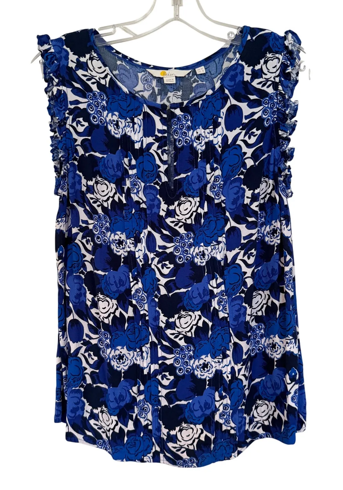 . Brighten your wardrobe with this charming Boden top, adorned with a vibrant blue floral print that evokes a whimsical garden. Delicate ruffles cascade down the sleeves, adding a touch of playful femininity, while subtle pleating and a flattering keyhole neckline create a sophisticated silhouette. Excellent, pre-owned condition. Ships from a non-smoking home. Measurements: • PTP: 18" • Length: 24" Keywords: Boden, floral print, ruffle sleeves, keyhole neck, pleated, women's top, blue floral, feminine, casual, brunch outfit, day out, garden print, summer top